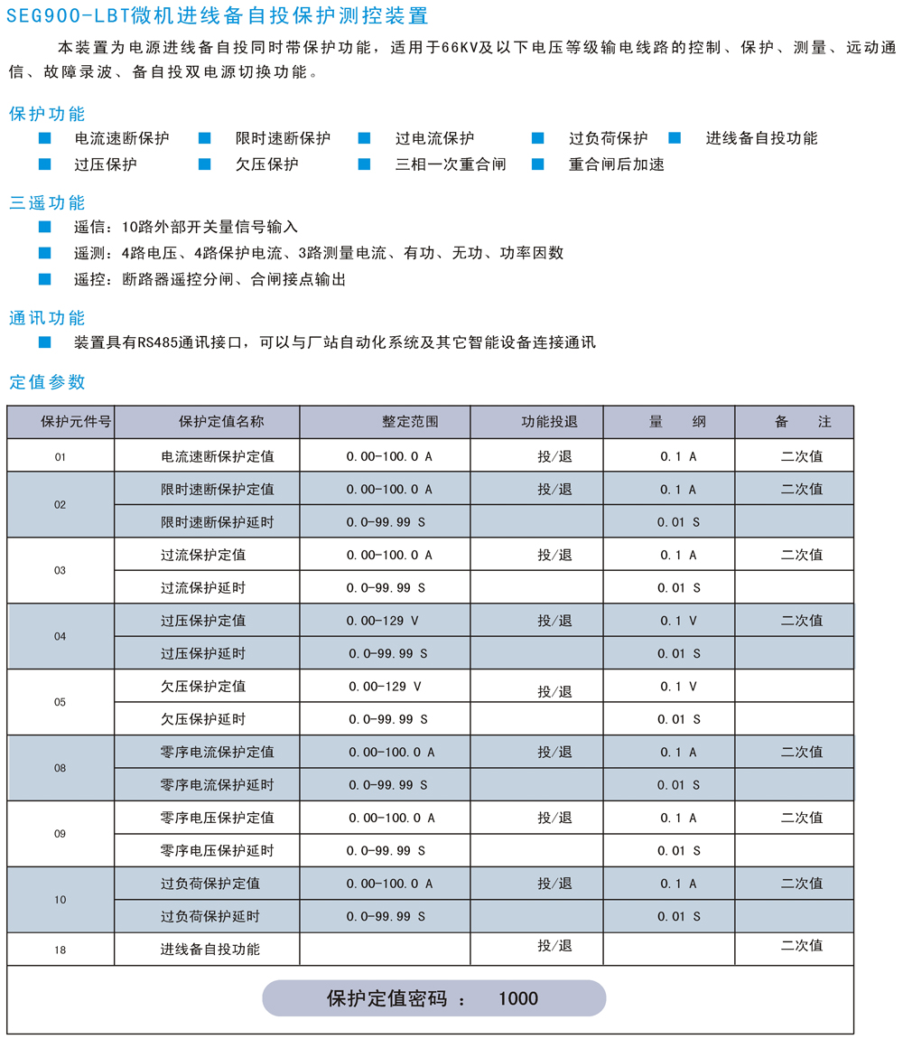 SEG900-LBT微機進(jìn)線(xiàn)備自投保護測控裝置